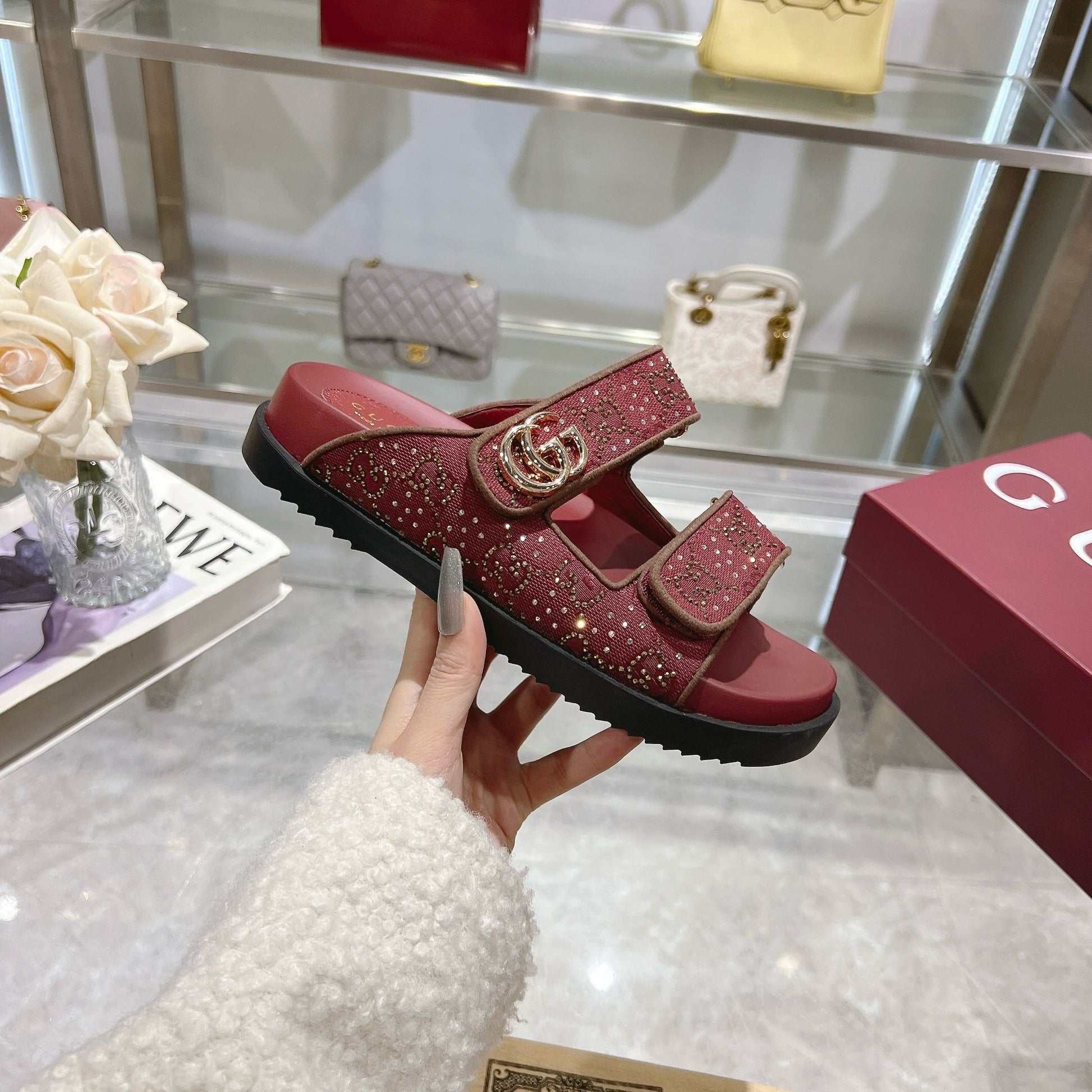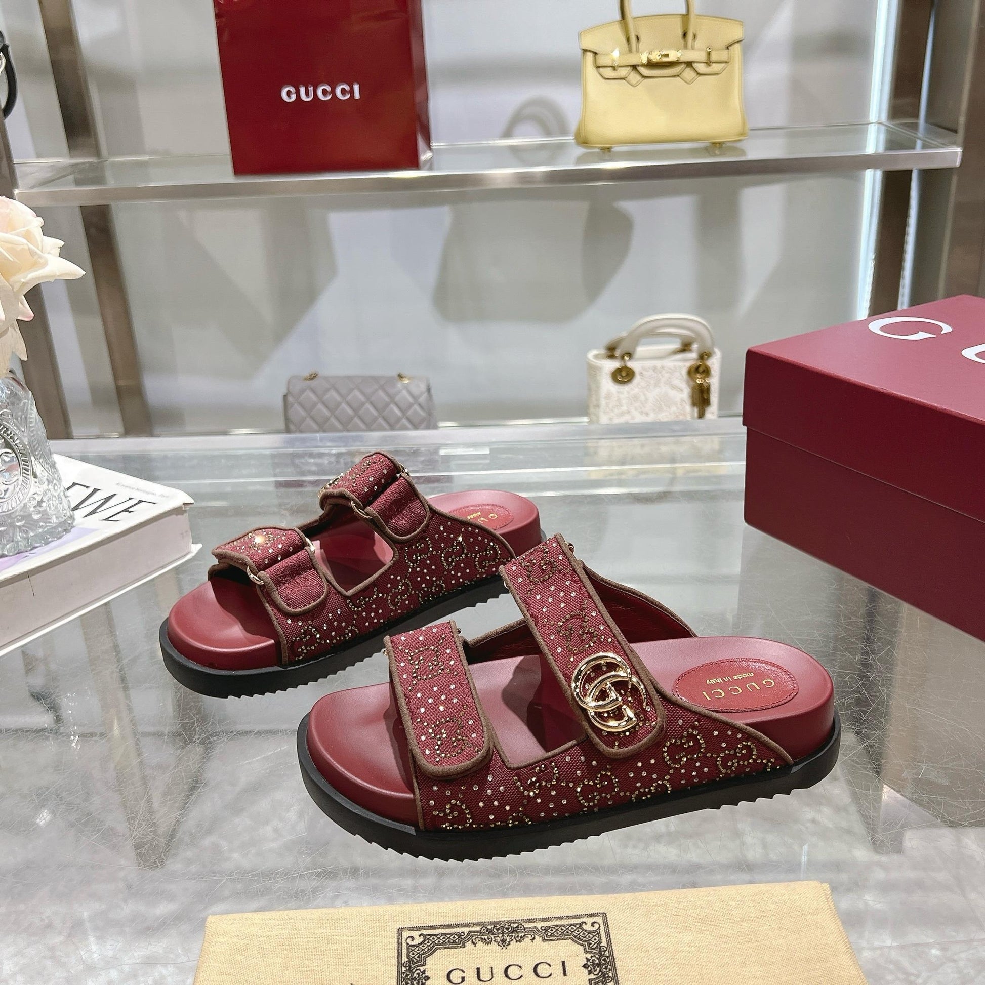 כפכפי גוצ׳י לאישה העשויה מעור בצבע בורדו.